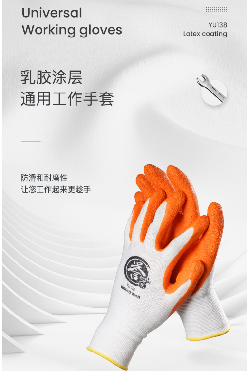 霍尼韦尔(Honeywell)霍盛劳保手套YU138 10副/包 掌浸防滑天然乳胶防护工作手套8码