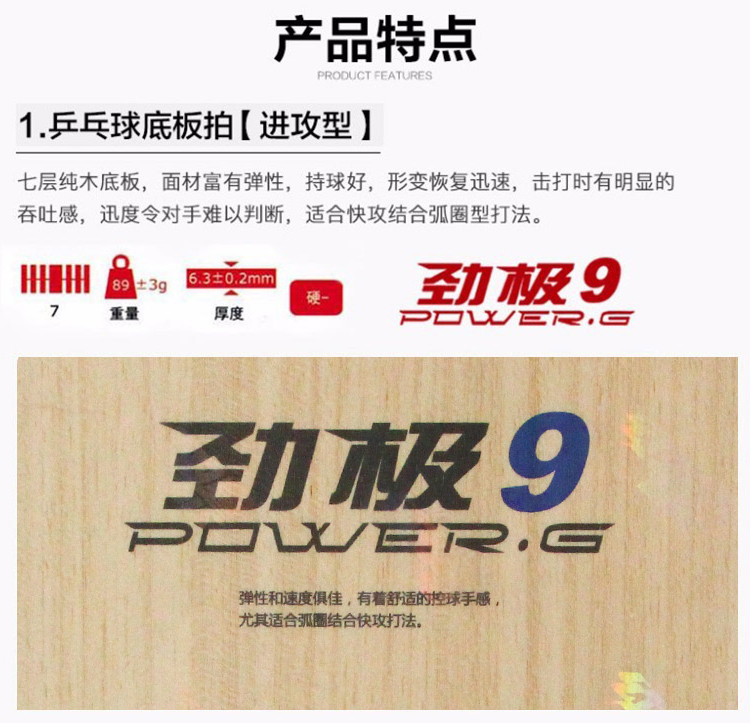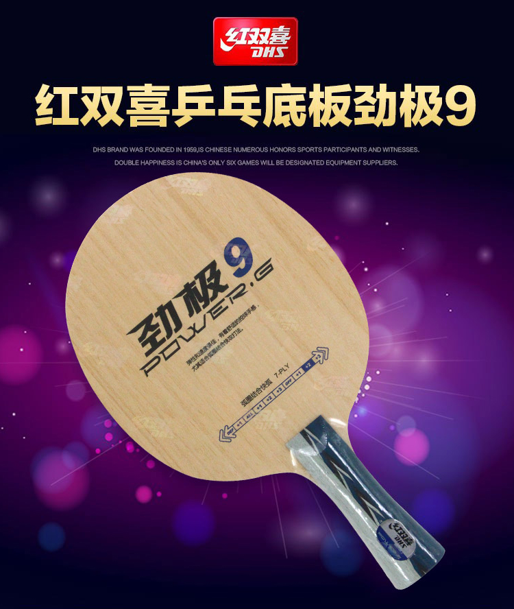红双喜DHS劲极9乒乓底板 加强7层纯木快攻弧圈PG9横FL(定制品)