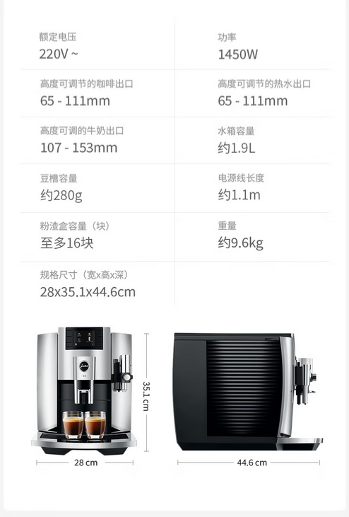 jura全自动咖啡机 优瑞新E8 欧洲原装进口 家用 办公 一键制作 中文菜单 一键清洗 研磨升级香浓加倍