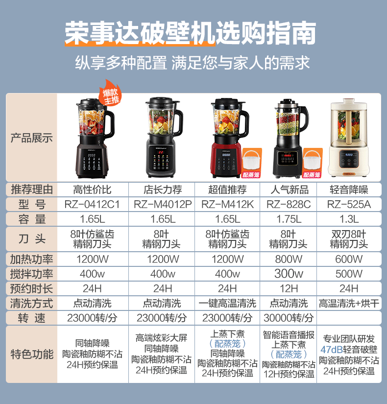 荣事达(Royalstar)破壁机家用豆浆机智能预约加热料理机多功能绞肉馅磨粉搅拌机榨汁机辅食机 RZ-M4012P