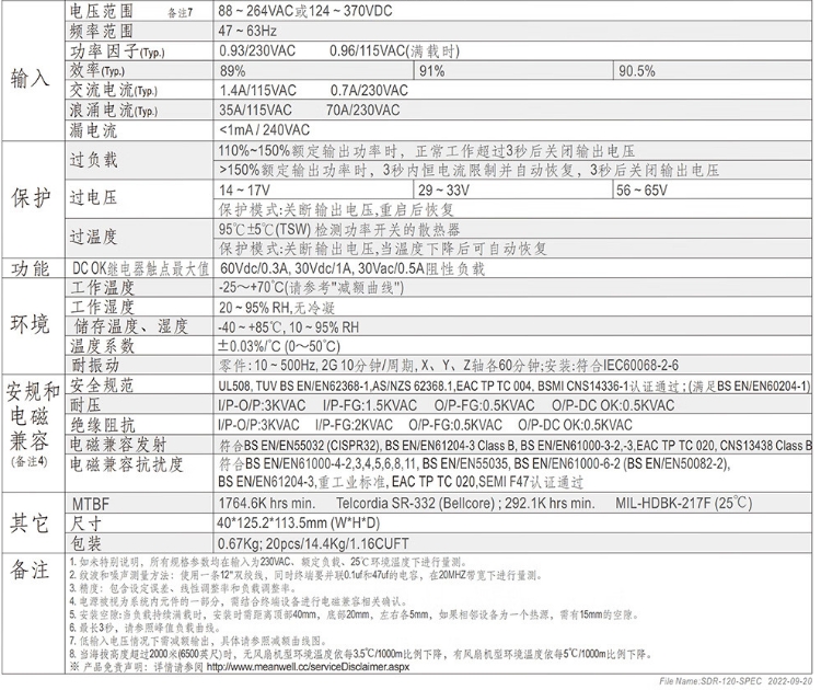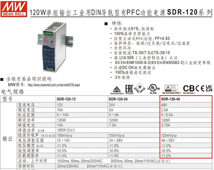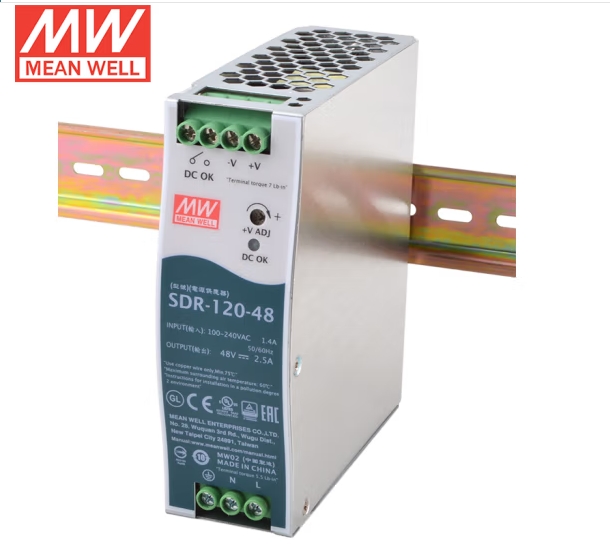 明纬(MEANWELL)SDR-120-48导轨式小体积开关电源可调2.5A 48V