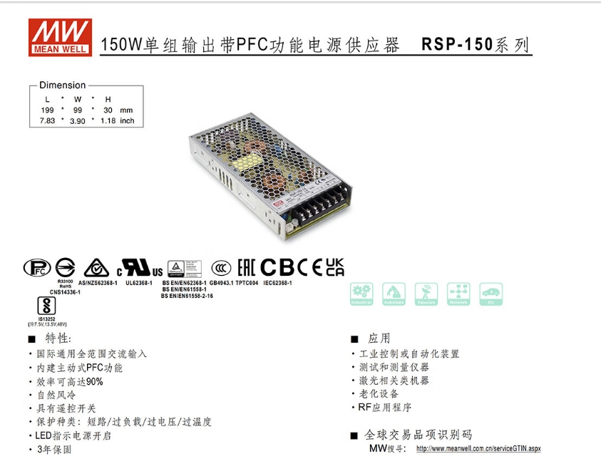 明纬(MEANWELL)RSP-150-27开关电源( CCC认证) 带PFC功能电源供应器 27V5.6A