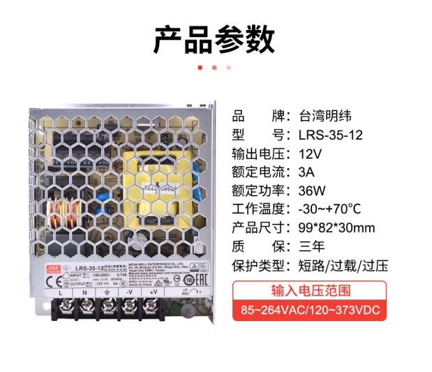 明纬(MEANWELL)开关电源12V 3A输出 替代NES直流DC稳压变压器监控 LRS-35-12