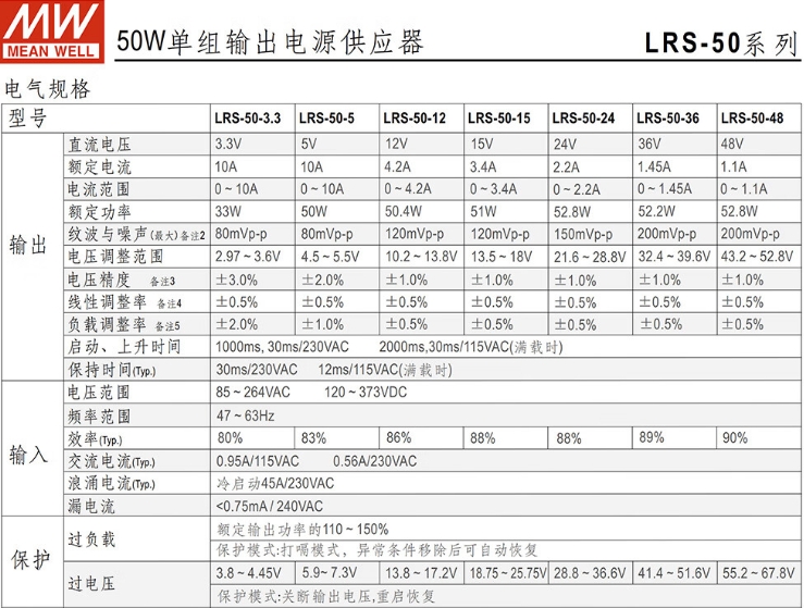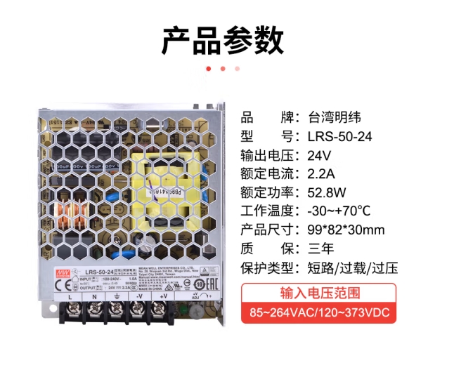 明纬(MEANWELL)LRS-50-24 替代NES直流DC稳压变压器监控 开关电源24V2.2A输出
