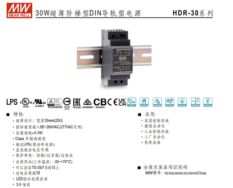 明纬(MEANWELL)HDR-30-15 导轨安装开关电源 明纬电源 2A 15V