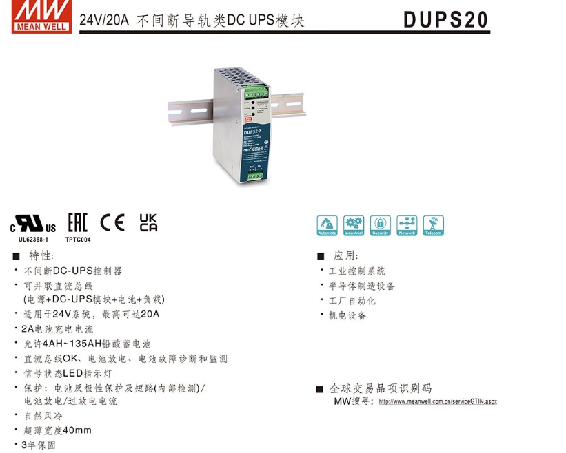 明纬(MEANWELL)明纬开关电源24V 20A 安防应急模块直流不间断导轨类DC UPS模块 DUPS20