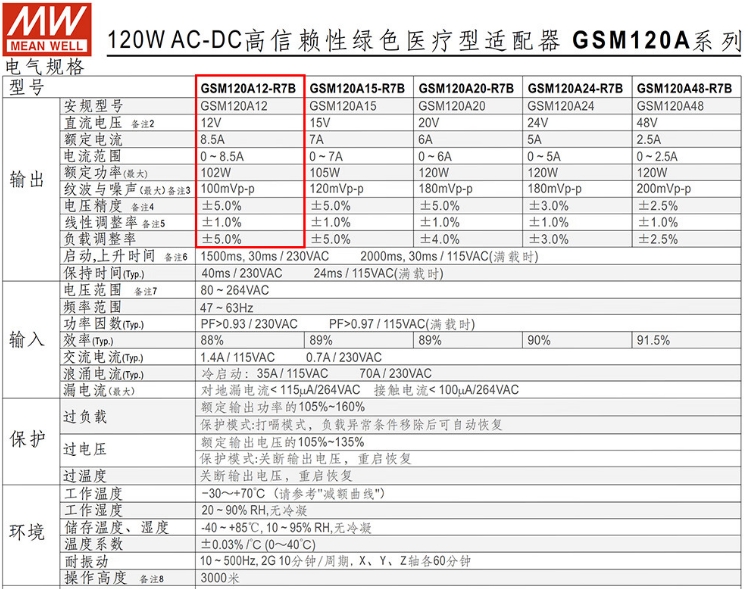 明纬(MEANWELL)明纬电源12V 8.5A 医疗级电源适配器 GSM120A12-R7B(不含输入线)