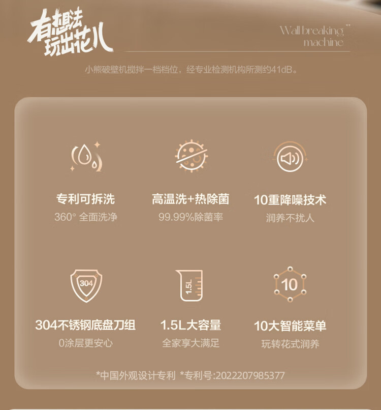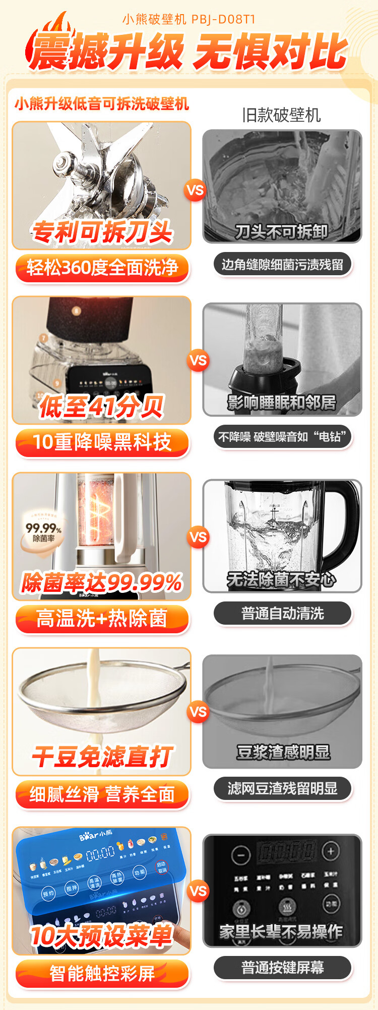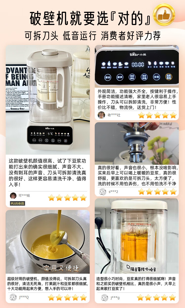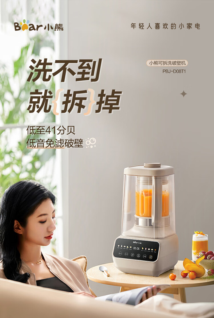 小熊(Bear)低音降噪破壁机 1.5L家用可拆洗豆浆机 多功能全自动米糊机 五谷杂粮料理机榨汁机41分贝PBJ-D08T1