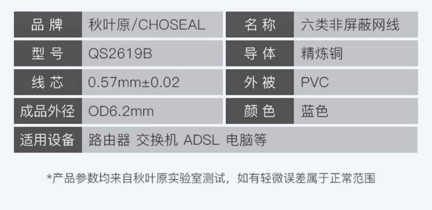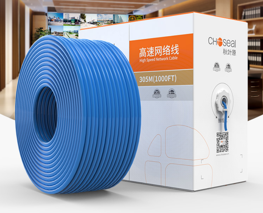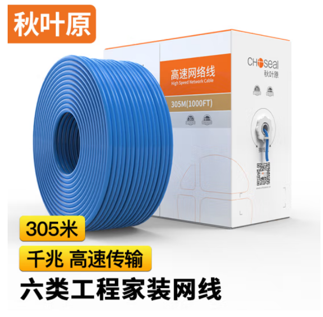 秋叶原(CHOSEAL)六类网线【工程版0.57±0.02mm】CAT6纯铜线芯阻燃非屏蔽千兆网线蓝色305米QS2619BT305