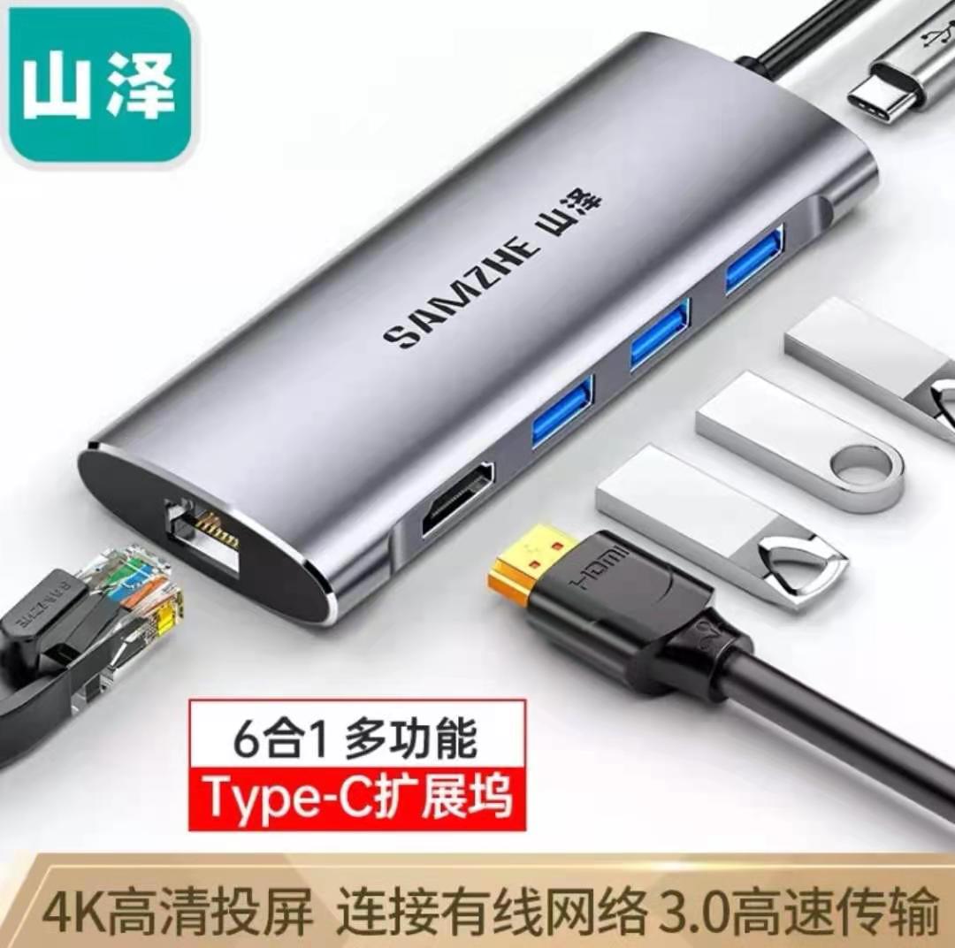 山泽Type-C拓展坞usb-c转hdmi网口PD接头华为联想笔记本电脑接口拓展转换器hub3.0分线器六合一TH-04 yykj-240312100203