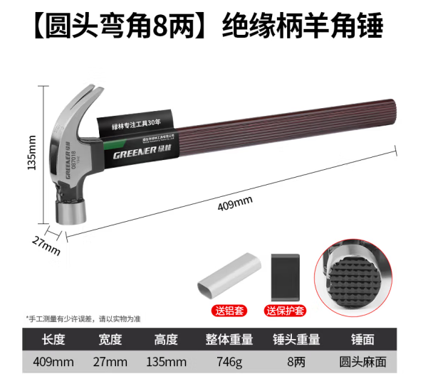 绿林(GREENER)绝缘柄羊角锤强磁多功能锤木工工地高碳钢锤头 【圆头弯角8两】087018