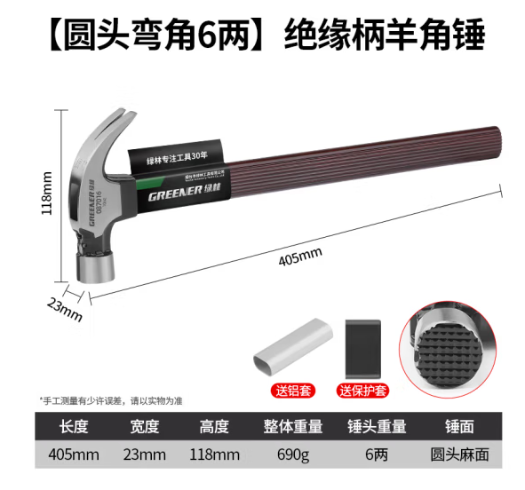 绿林(GREENER)绝缘柄羊角锤强磁多功能锤木工工地高碳钢锤头 【圆头弯角6两】087016