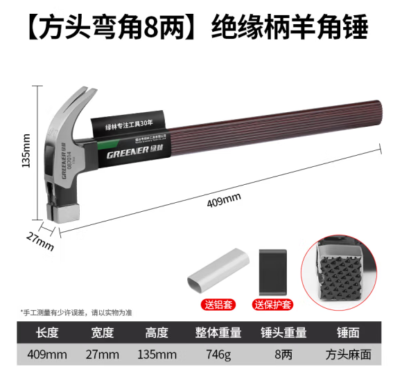 绿林(GREENER)绝缘柄羊角锤强磁多功能锤木工工地高碳钢锤头【方头弯角8两】087014