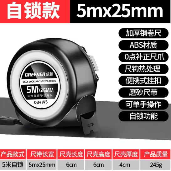 绿林(GREENER)5米高精度加厚加硬盒尺 防割自锁钢卷尺 5mx25mm 034195