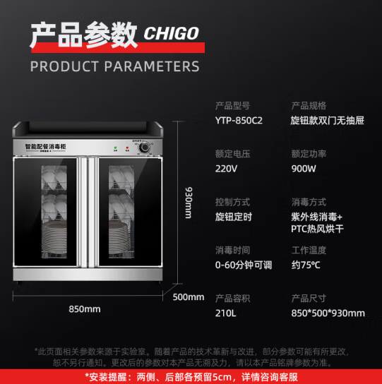 志高YTP-850C2茶水消毒柜 立式餐厅饭店配餐柜 厨房餐具茶杯碗筷柜 臭氧中温红外线保洁柜 双门170升旋钮无抽屉