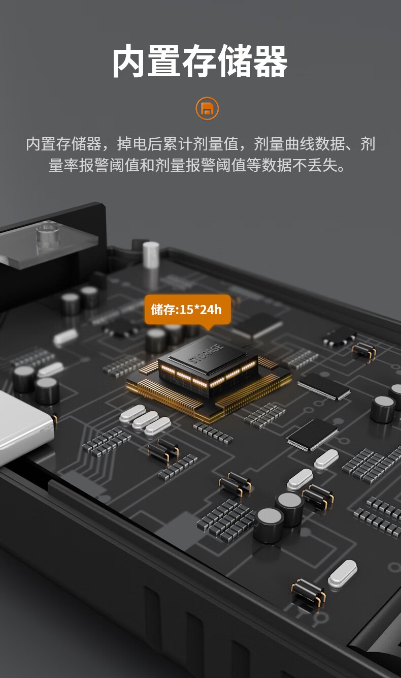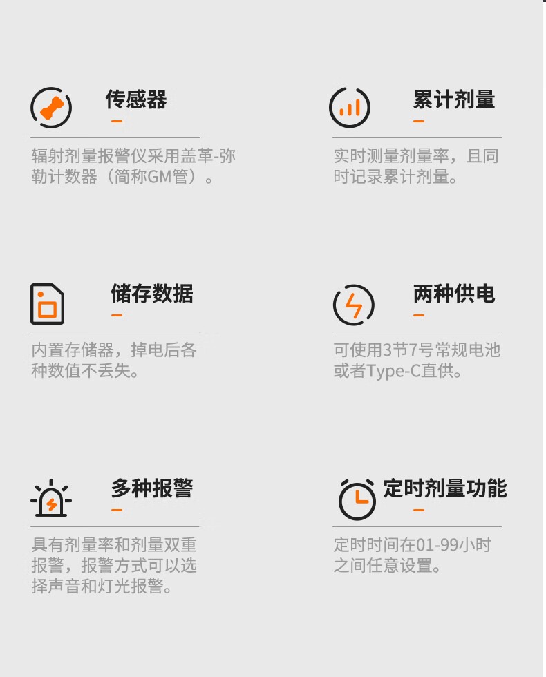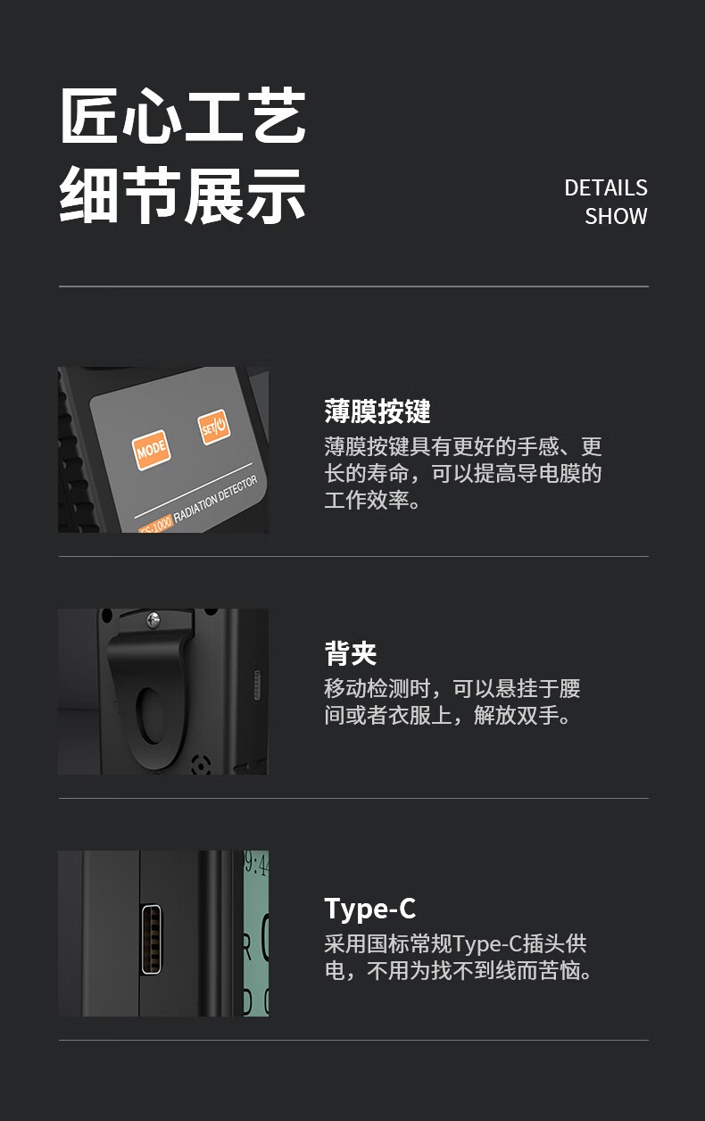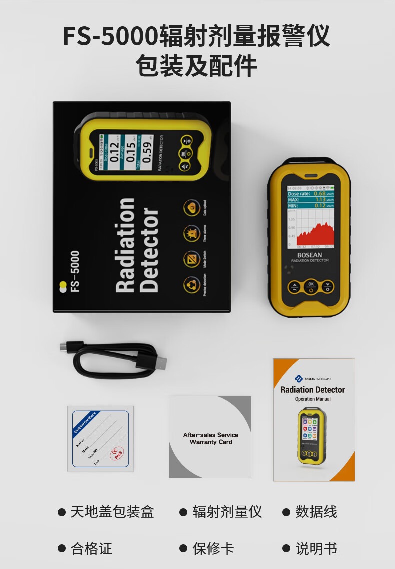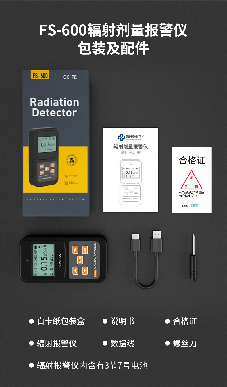 包装清单 磁吸包装盒,说明书,合格证,核辐射检测仪,数据线,螺丝刀,辐射报警仪内含有3节7号电池。