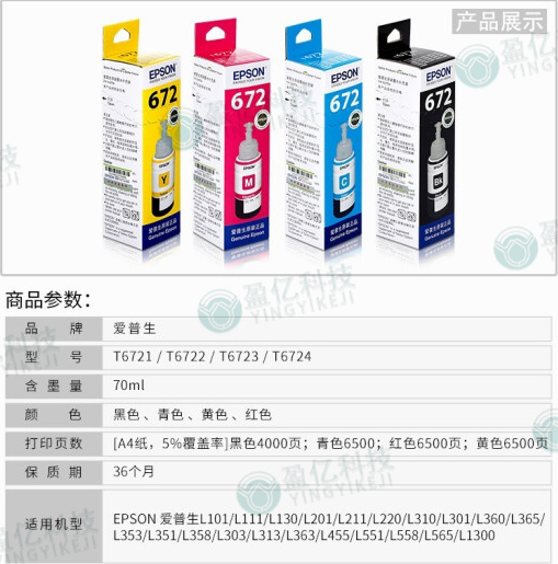 爱普生 原装墨水 672系列 适用L360/L310/L220/L365/L455/L1300 颜色请备注